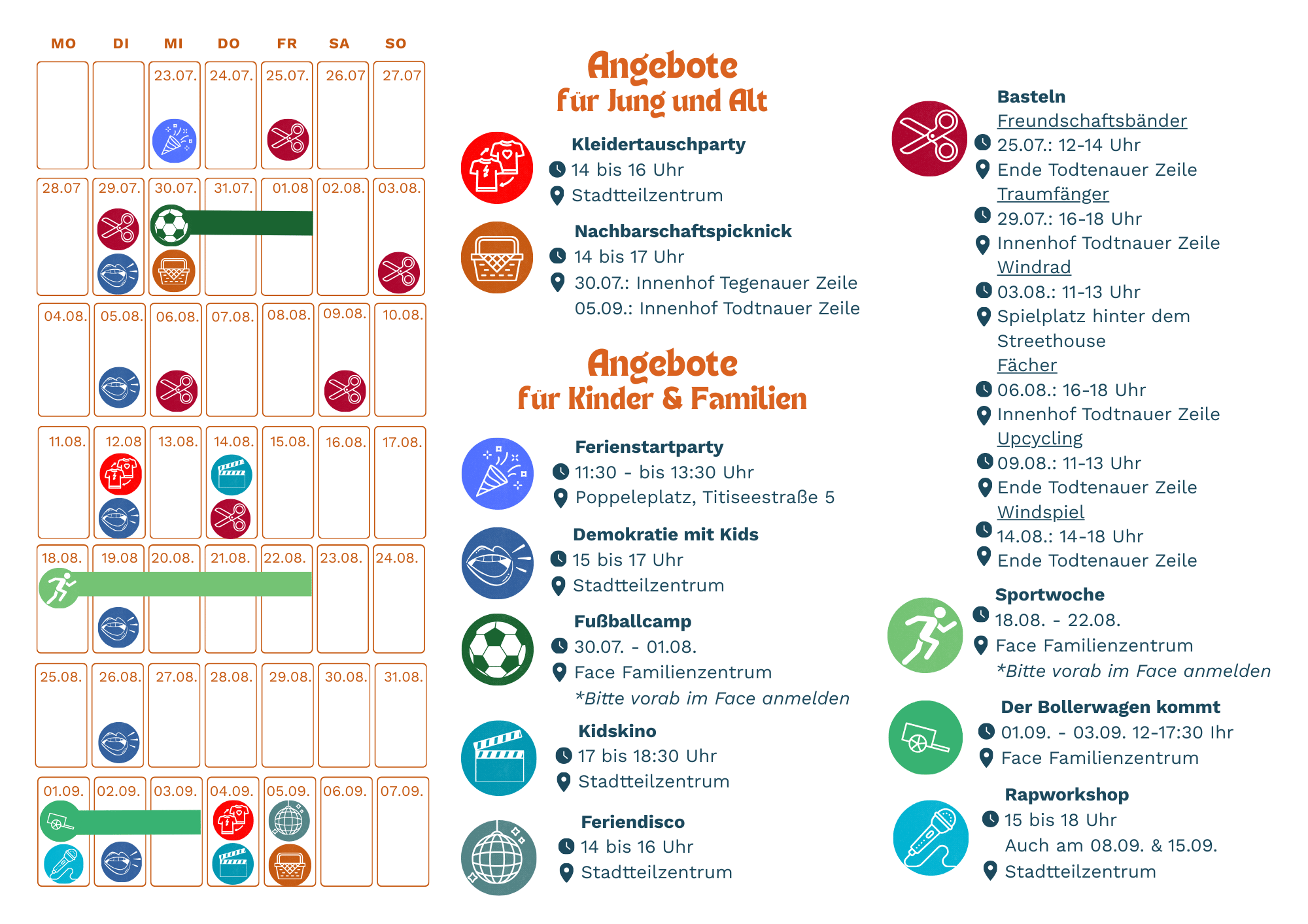 Die Sommerferien stehen vor der Tür, und ein abwechslungsreiches Ferienprogramm in den Rollbergen erwartet euch! Kommt vorbei und erlebt in euren Sommerferien zahlreiche Angebote voller Spaß und Abenteuer für Jung und Alt. Lasst uns gemeinsam großartige Feste feiern, kreative Nachmittage genießen, sportliche Tage verbringen und an spannenden AGs teilnehmen. Das ganze Ferienprogramm findet ihr hier.